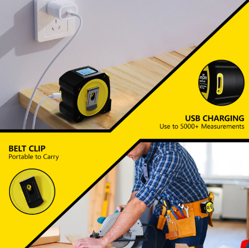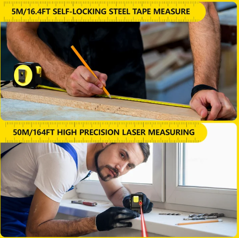 2-In-1 Functionality: Combines a 164ft high precision laser distance measure and a 16.4ft self-locking steel tape measure.
