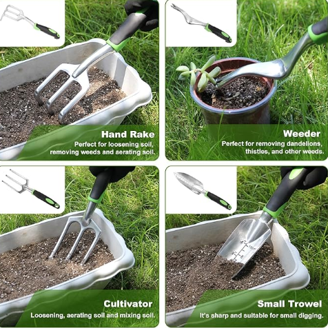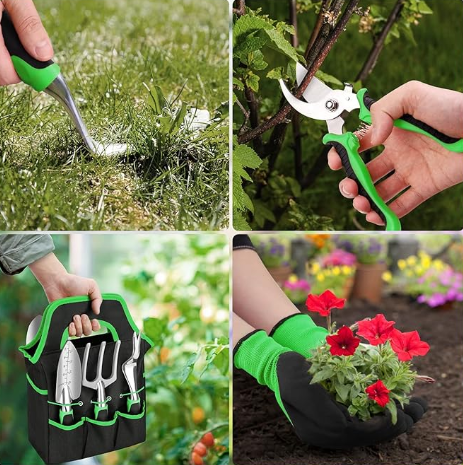 You could find a pair of gloves, soil scoop, small trowel, cultivator, hand rake, pruner, weeder and an tote bag to keep all the tools packed away in our garden tools set,